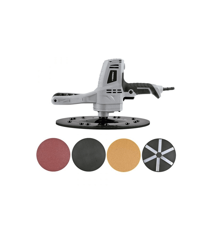 Corpo de ABS e Alumínio, interruptor com botão de operação contínua, sistema de extração compatível com aspirador, agarramento ergonômico antiderrapante, cabo com protetor de punho, cabo auxiliar, selecionador de velocidade, fixação com velcro, extensível, dobrável, inclui: 6 discos, mangueira de sucção de 4.5m, mala de transporte.